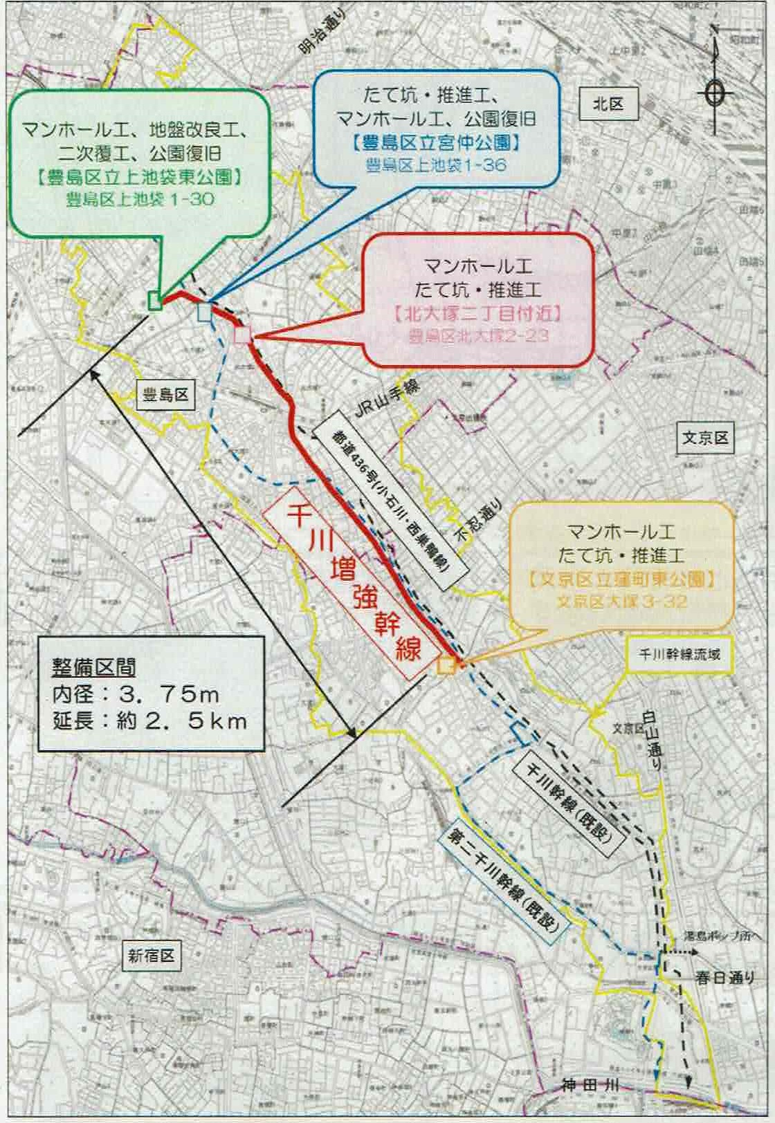 平成26年(2014年)7月、千川幹線(北大塚、大塚三業通りなどを通る下水の幹線)の下水道再構築工事が完了しました。